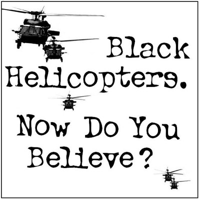 for more years than I can count, I've been exposed to brazen conspiracies, wild ideas, crazy thoughts, survivalist mentalities, isolationist individuals, "Doomsday Preppers" and all through those past years, "Black Helicopter" Conspiracies.