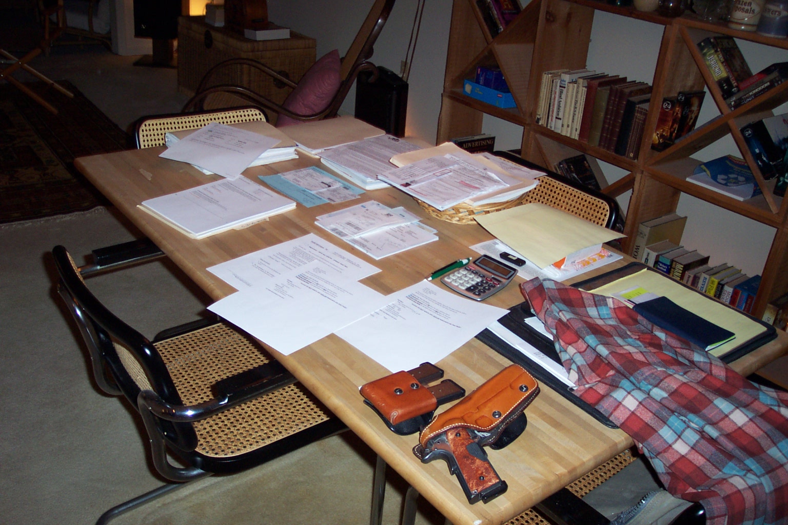 Up at 5:30am on Thursday, the morning was a windy and cold 17° start, to the day. Heat and coffee helped. So did Sunny-Side-Up Eggs & Toast, for a quick breakfast. As squalls blew thru the area, the snow became heavy but short lived. I had a boatload of places to go and stops to make, so I left at 9am. I hit the bank, Weis Market, gun shop, hardware store, Home Depot, computer store, post office, and stop for a visit at Dad's to get some paperwork copied. We had lunch, and I was back home by 2:30pm, unloaded and got back to the IRS filing project for 2014 taxes. Joy. Soon enough, it was 6pm. dark, and I had the the morning's missed Chris Plante Show WMAL (DC) Podcast on, while I took inventory of some rotated-out food shelves in the basement stores. My DR table "office" still looks like Einstein's Office's Desk – well, not that bad – but that'll improve shortly as I continue to hack away at the unnecessary paper and re-file it. By 11pm, I was tired, had enough and closed down for the night.