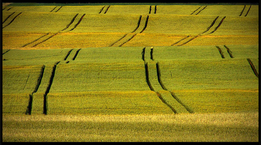 things are not always what they seem, at first glance. Those "tire tracks" would appear to be from malicious kids' cars driving through planted wheat fields, intending to destroy crops and ruin hard-working farmers' overall yields. But they're not. Those tracks are from massive sprayers with 8ft high tires, 30ft spray-booms on both sides, spraying fungicides on early wheat crops, so they don't get the "G4318 wheat streak mosaic virus (WSMV)". Only a comparatively-few rows are damaged, in order to save the entire crop. Makes sense now that you know the real story, so that when you see "the tracks", it won't surprise or anger you, as it's done with many people who see it. It's not what it seems.