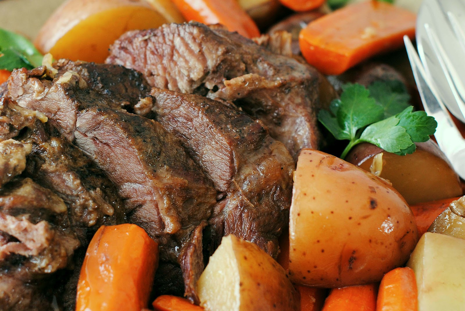 I made one of my "Super Pot Roasts", with a beautifully-marbled, 3-lb USDA Prime Black Angus cut, in the 6qt Rival CrockPot® with chopped scallions, peeled whole Vidalia onions, peeled whole small Idaho potatoes, peeled baby carrots, peeled whole garlic cloves, cut celery, a touch of A1 Steak Sauce®, unground Kosher Sea Salt, whole black peppercorns, 32oz of Swanson® beef stock – after