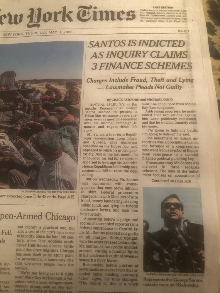 And the New York Times played right along with the Justice/FBI game. In yesterday’s print edition, the lead front page headline, covering two of the six columns, was “Santos Is Indicted as Inquiry Claims 3 Finance Schemes” (different headline online). The accompanying story fills the whole two columns above the fold.