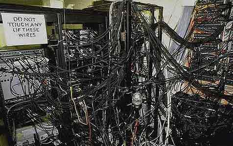 neither my office or home computers look nowhere near as bad as the above picture depicts, but it's difficult to locate and trace exact wires from the back of the new server, my personal office computer, to the monitor, periphals, printers, 5.1 Surround Sound System, 1-Tb & 2-Tb Western Digital storage/ back-up, plus APC unit etc. BTW, those are two mainframes "spliced together" back in the 60s.